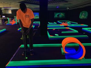 The course is all indoor and covers 18 holes. The location inside of Pierre Bossier Mall, across from the Hallmark store, is completely illuminated with a black lights leaving everything glowing. The final hole is called the “prize hole.” Knight said this hole is the most challenging. If you win, you get a free game of golf another day.