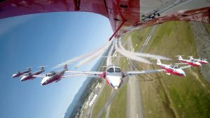 The Snowbirds fly the Canadair CT-114 Tutor, a Canadian-built jet that was used by the Canadian Forces as a basic pilot-training aircraft form 1963 until 2000. The Tutor weighs approximately 7,170 lbs., with a wingspan of 36.5 feet, and is powered by a J-85 engine producing 2,700 pounds of thrust. The Snowbirds fly nine planes in formation, often five abreast, which means all nine planes are within a 70-yard radius.