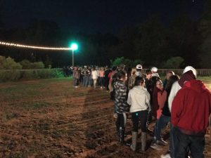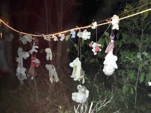 The haunt’s story started out with a wrecked insane asylum bus at the home of some escaped patients and the trail leads through their property. It has evolved each year, continuing the story.
