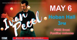 Watch as Ivan Pecel entertains and makes juggling interesting. Pecel is a star comedian who specializes in the talent of juggling. Encouraging audience participating, he blends his skills with clean humor. Hosted by Air Force Entertainment, this show is free and anyone with access inside the base is welcome to attend.
