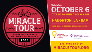 Riders who raise funds will receive great incentives including a 2018 Miracle Tour jersey and the chance to win prizes. Every dollar raised stays in Shreveport-Bossier to support the Children’s Miracle Network Hospital programs at CHRISTUS Health Shreveport-Bossier.